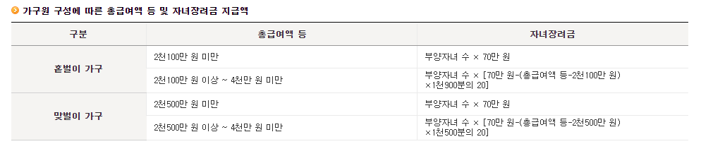저소득 가구의 자녀양육 부담을 경감하기 총소득 4,000만원 미만이면서 부양자녀(18세 미만)가 있는 경우 1명당 최대 70만원을 지급하는 제도로 총소득 기준을 제외한 나머지 수급요건은 근로장려금과 동일합니다.
