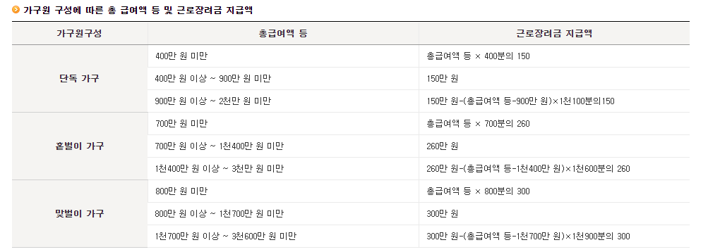 근로장려금은 거주자를 포함한 1세대의 가구원 구성에 따라 정한 부부합산 총급여액 등을 기준으로 지급되며, 연간 최대 지급액은 300만원 입니다.