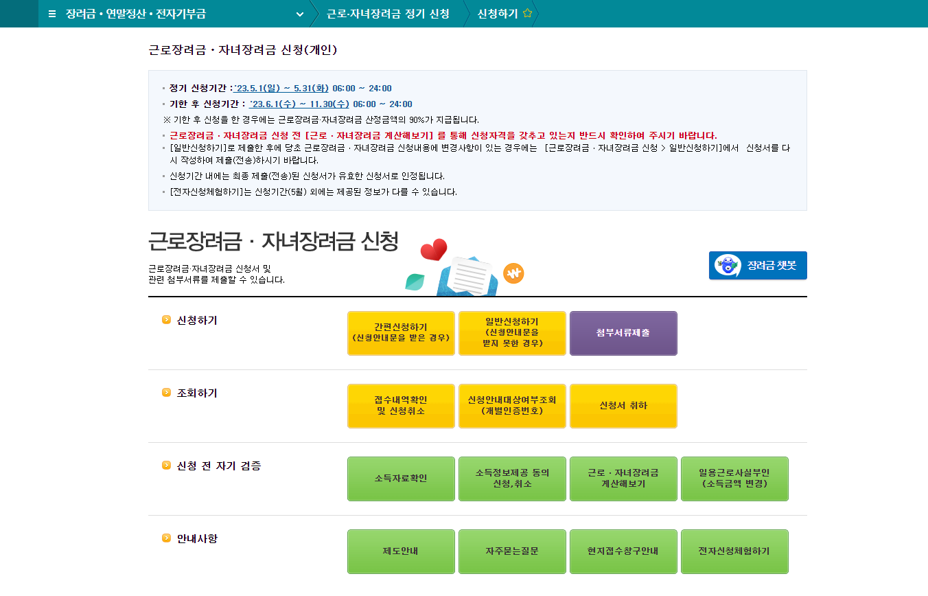 홈택스 로그인 → 장려금.연말정산.전자기부금 → 근로.자녀장려금 신청 에서 가능합니다.