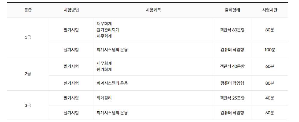 필기시험 재무회계 + 원가관리회계 + 세무회계 과목으로 구성되어 있으며 객관식 60문항으로 시험시간은 80분이다.