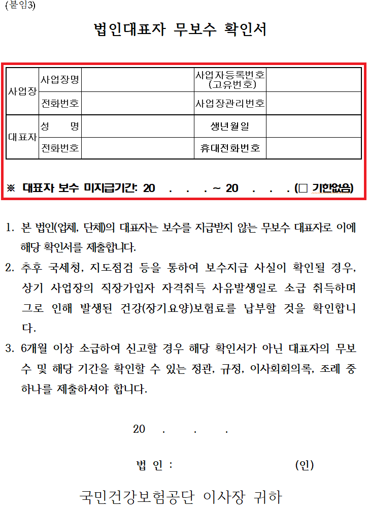 법인 및 개인사업자의 대표자 사대보험 가입 법인대표자무보수신고서식 대표자고용보험 및 산재보험 신청서식 다운로드