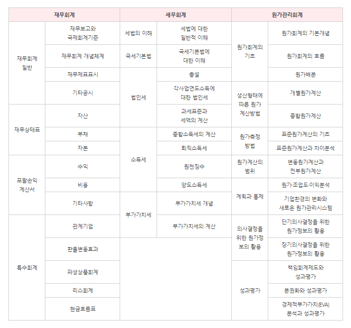 삼일회계법인에서 시행하고 있는 국가 공인 자격시험입니다. 재무회계, 세무회계, 원가관리회계 지식과 실무능력을 갖춘 재경전문가로의 역할을 수행할 수 있는지 평가하는 자격시험입니다.