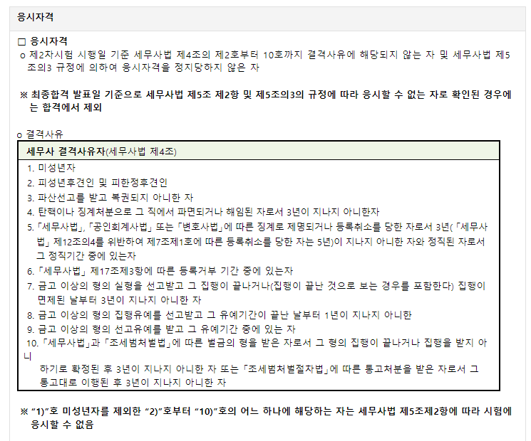 세무사 시험은 1년에 한번 있으며 매년 2월 정도에 시험일정이 발표된다. 1차에 합격한 자에 한해서 2차시험이 있다.