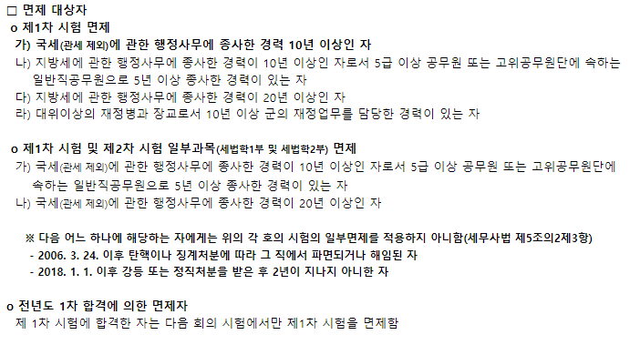 | 1 | 1. 재정학 2. 세법학개론(국세기본번, 국세징수법, 조세범처벌법, 소득세법, 법인세법, 부가가치세법, 국제조세조정에관한법률) | 과목당 40문항 (총 80문항) | 80분 (09:30~10:50) | 객 관 식 5지택일형 |
