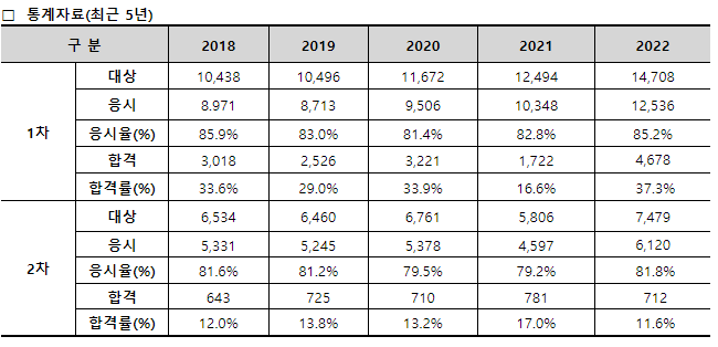 -합격기준 : 과목당 100점을 만점으로 하여 각 과목의 점수가 40점이상이고 정 과목 평균점수가 60점 이상인 자