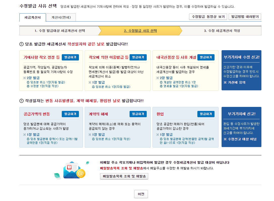 같은 세금계산서를 이중으로 발급하였을 때, 수정발급하는 방법입니다.