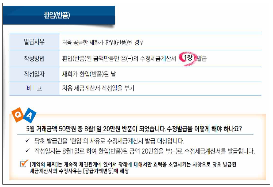 작성일자는 환입이 되는 날로 작성합니다. 수정세금계산서 1장이 발급됩니다.