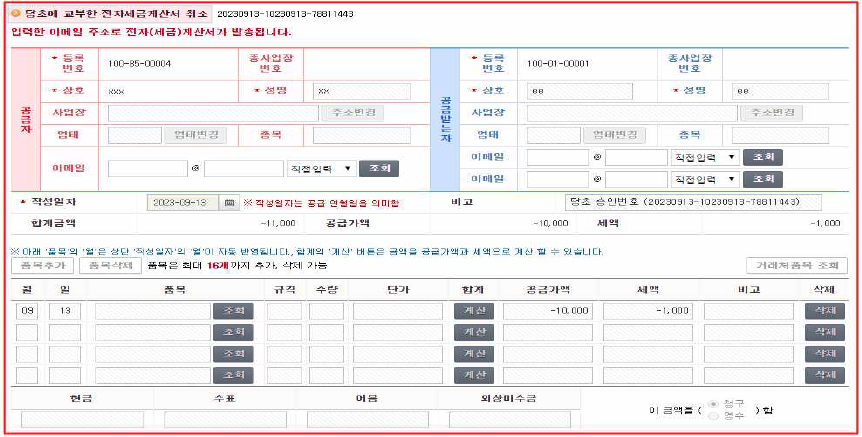 먼저 발급하였던 전자세금계산서를 조회 후 수정세금계산서를 발급하게 됩니다.