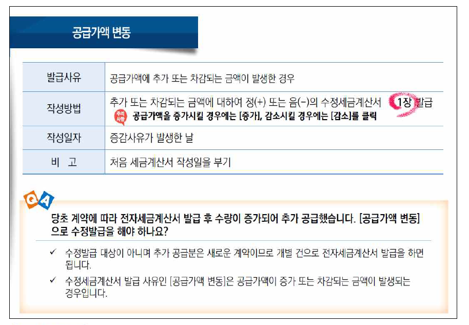 세금세금계산서의 공급가액에 수정이 생겼을 때, 수정세금계산서를 발행하는 방법입니다.