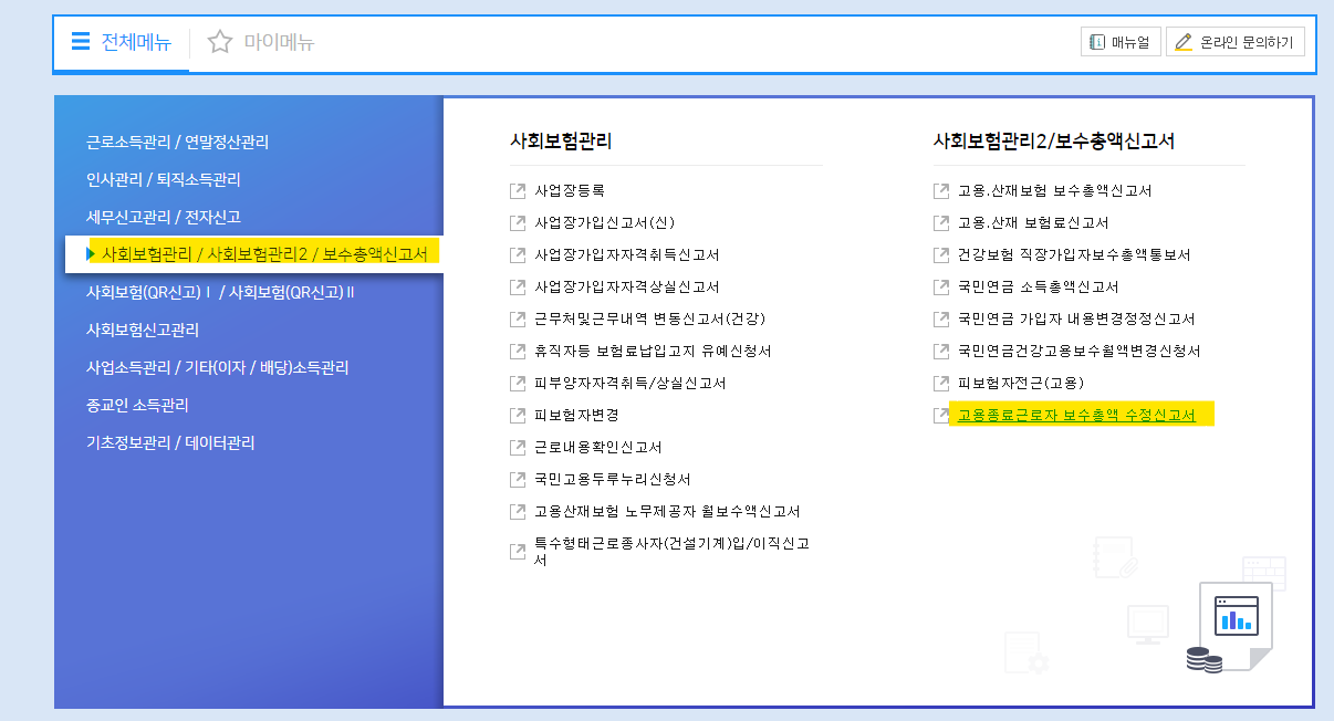 급여관리 - 사회보험관리 - 고용종료근로자 보수총액 수정신고서 작성