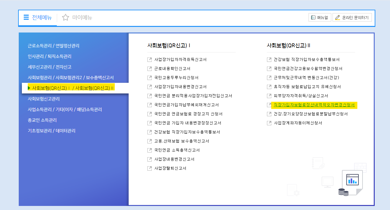 급여관리 - 사회보험 - 직장가입자보험료정산내역착오자변경신청서 작성
