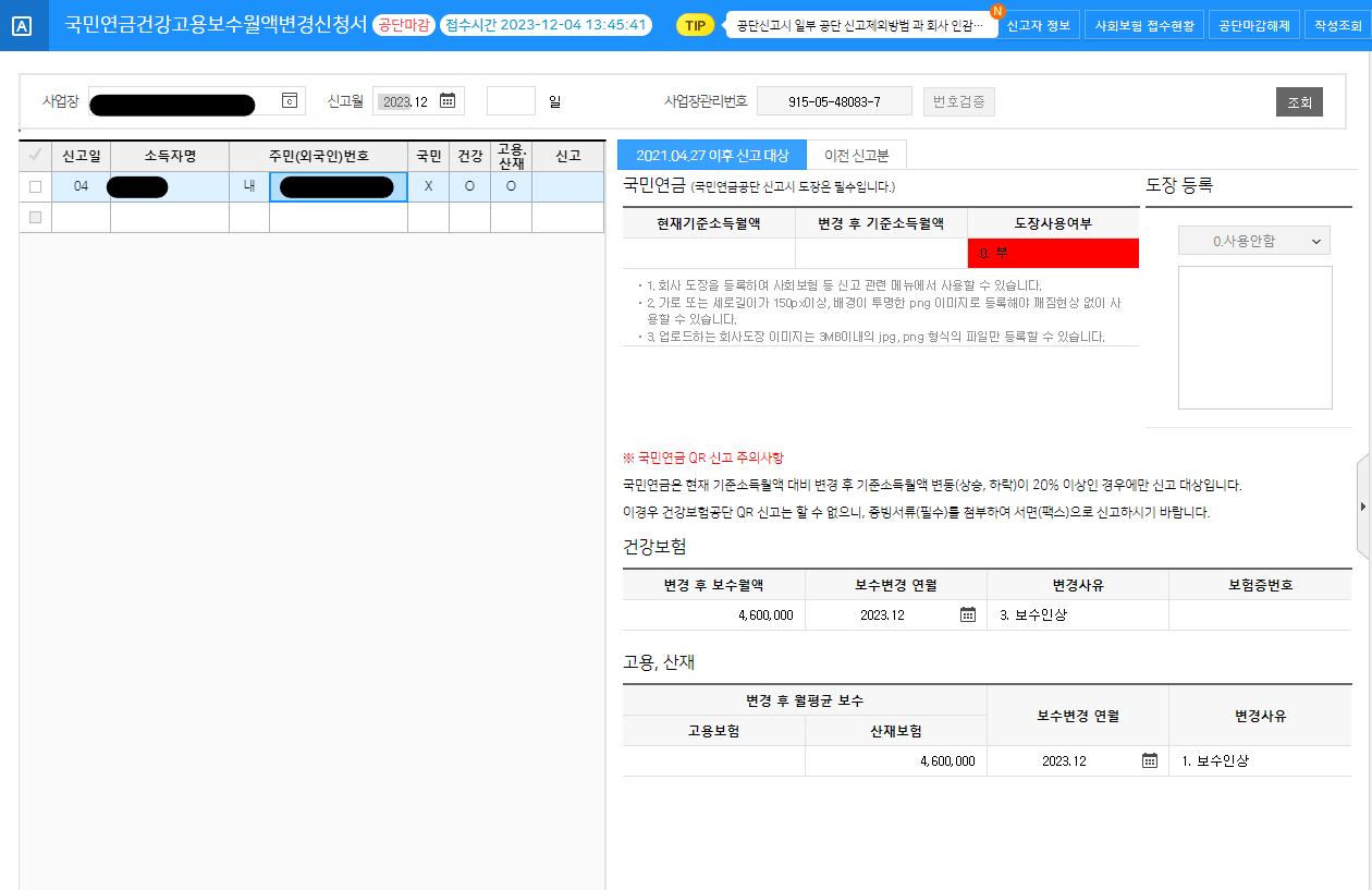 *국민연금의 경우 현재 기준소득원액 대비 변경 후 기준소득월액 변동폭이 20%이상이여야만 신고대상입니다.