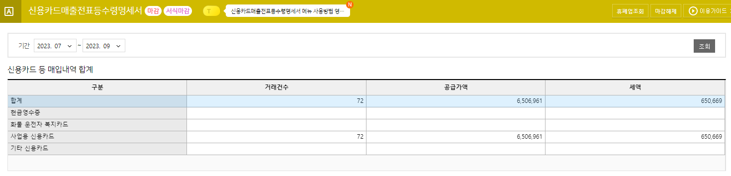 신용카드매출전표등수령명세서에서 금액을 확인하고 마감하기.