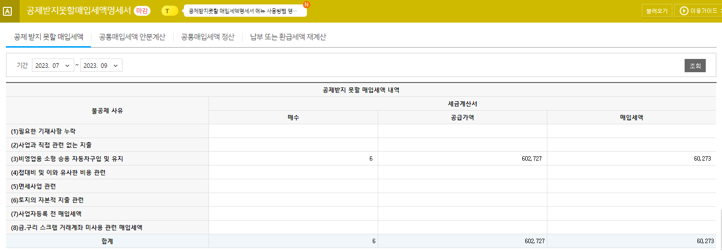 매입세금계산서 중에서 부가가치세 매입세액으로 공제 받지 못하는 내역이 존재하면 작성해주어야 하는 서식.