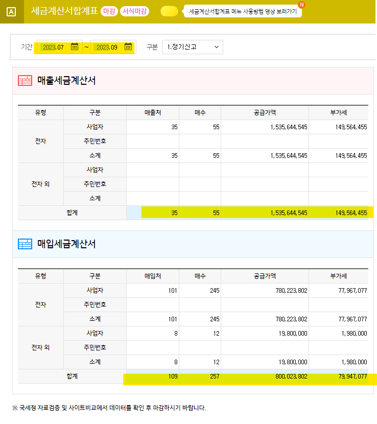 세금계산서 합계표에서 홈택스에 조회되는 값과 일치하는지 확인하고 마감.