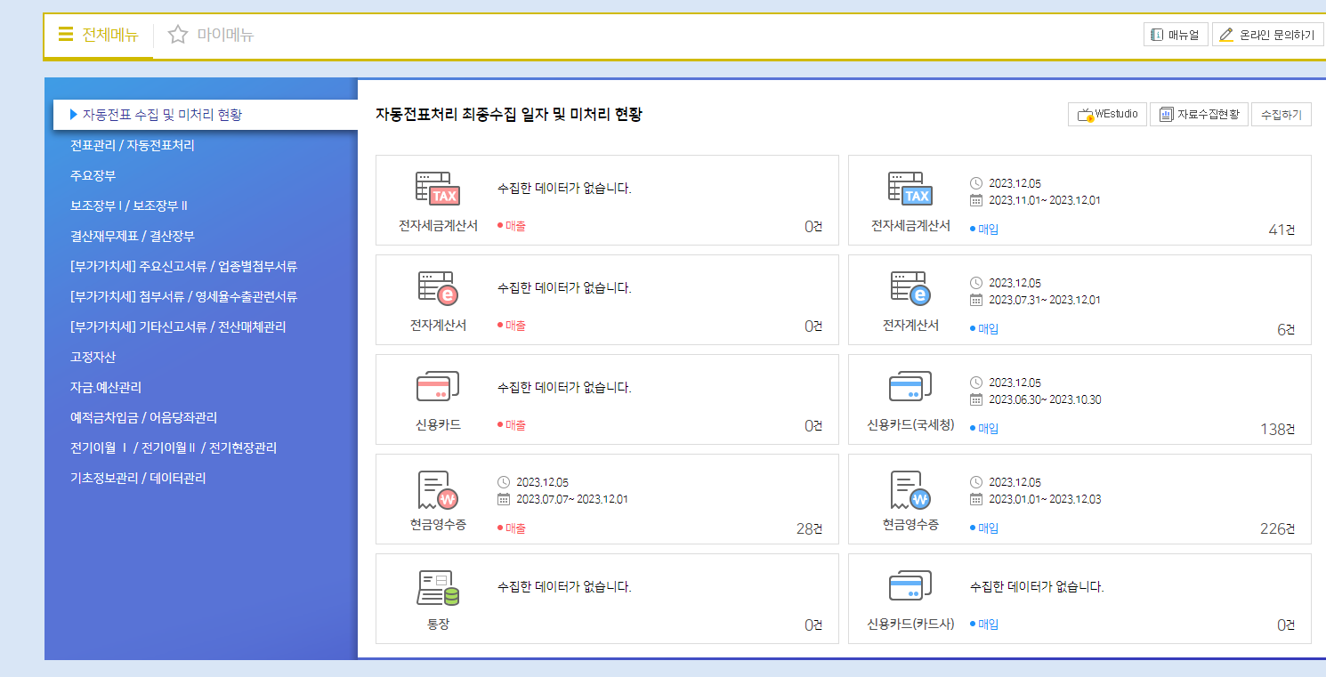 위하고에서 자동전표 수집으로 이동하면 전자세금계산서 기타등등 자료를 조회할수있다.