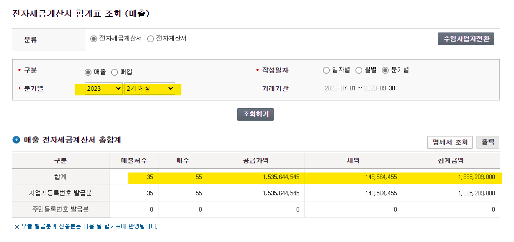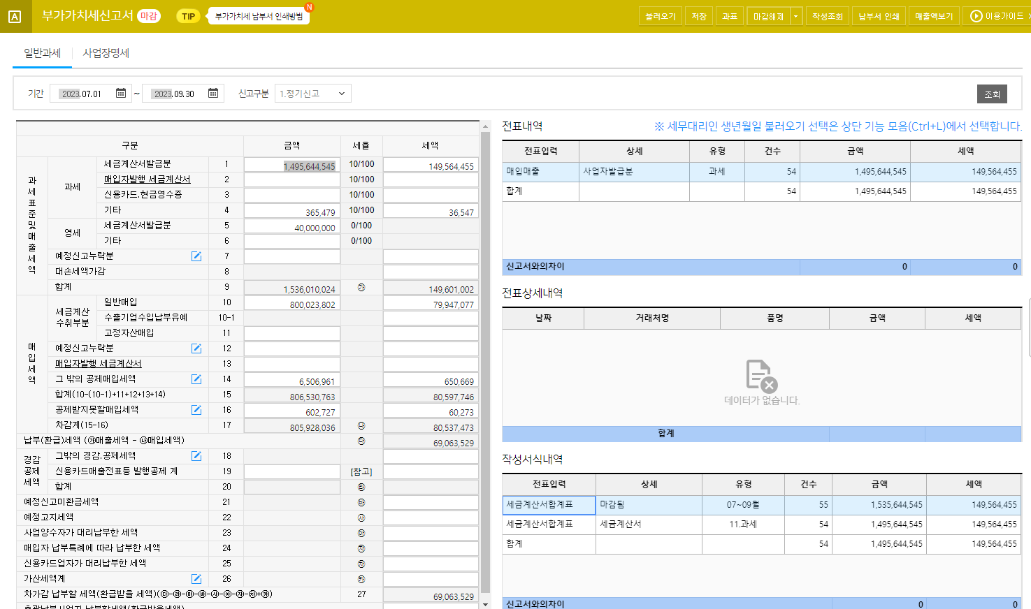 세금계산서 합계표에서 홈택스에 조회되는 값과 일치하는지 확인하고 마감.