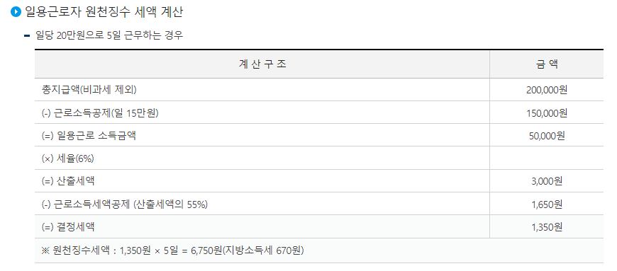 1. 총 지급액에서 근로소득공제 15만원을 차감하면 일용근로 소득금액이 됩니다.