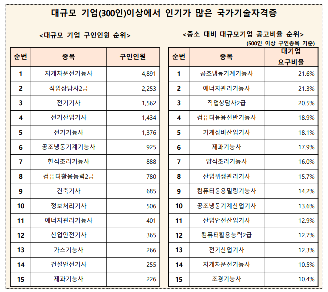 -300인 이상의 대규모 기업에서 가장 인기가 높은 국가기술자격증은 1위 기제차운전기능사, 2위 직업상담사2급, 3위 전기기사였으며 중견규모(30~299명)에서는 1위 지게차운전기능사, 2위 한식조리기능사, 3위 건축기사 순으로 나타났다.