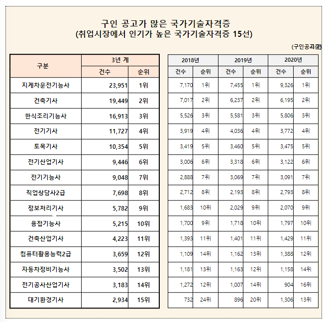 기업에서 필요로하는, 가장많이 찾는 국가기술자격증에 관하여 알아보았습니다.