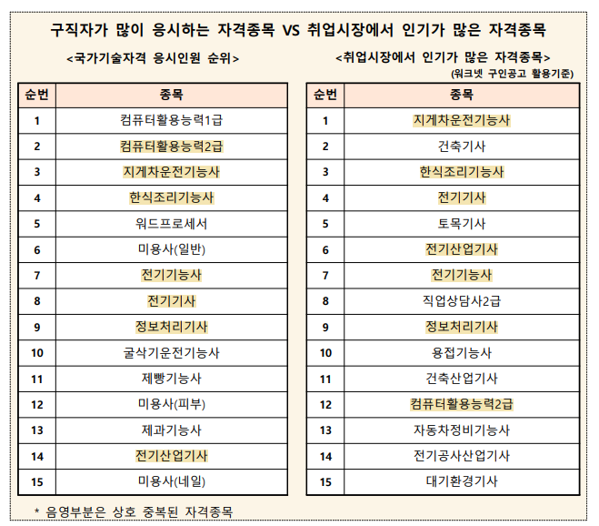 취업시장에서 인기가 높은 자격 15종목에 지게차운전기능사 등 7개 응시 상위종목이 포함되는 증 구인건수가 많은 자격 종목이 응시인원도 많은 것으로 나타났다.
