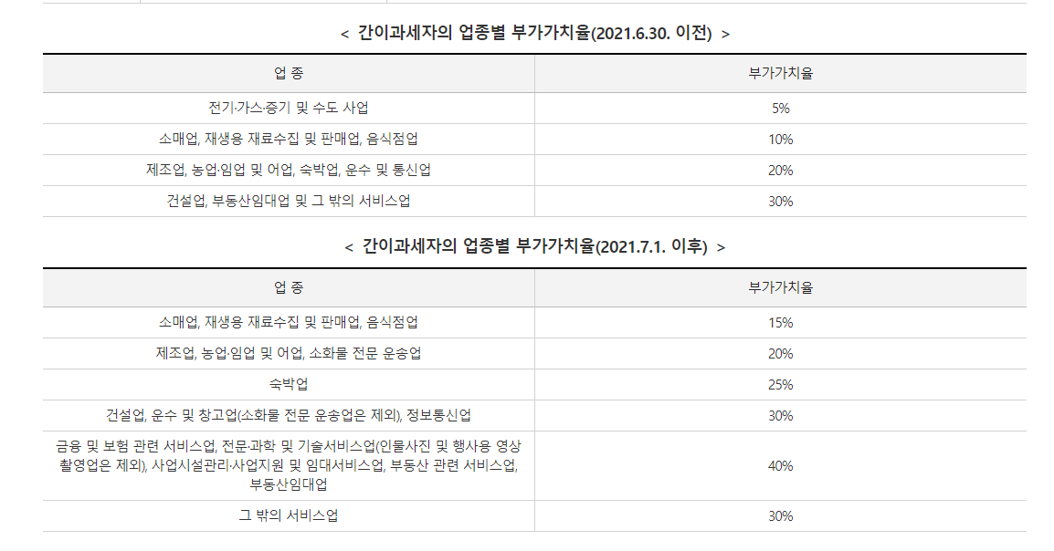 • 간이과세자 : (매출액x업종별 부가가치율x10%) - 공제세액 = 납부세액
