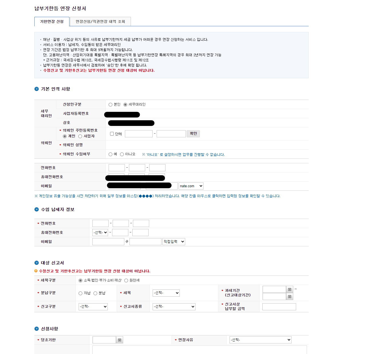 세무대리인 및 납세자의 기본인적사항을 작성 후 , 연장신청 할 세목에 대하여 작성합니다.