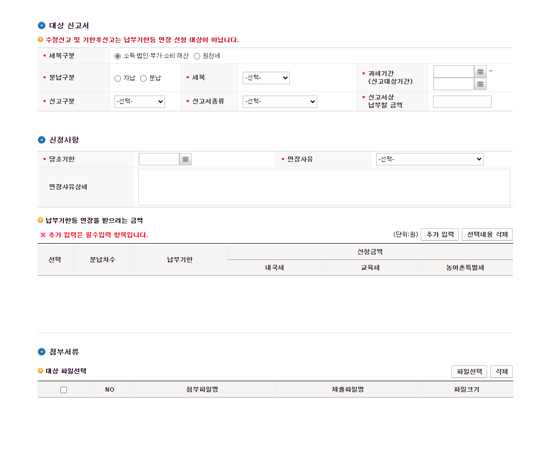 당초기한까지 납부하실 금액을 제외하고, 연장신청하는 금액에 대하여 작성하시면 됩니다.