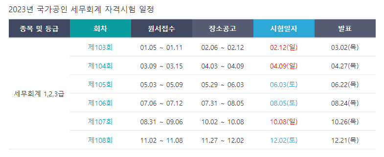 | 한국세무사회 전산세무회계자격시험 시험종류 시험일정 난이도 및 합격률 시험정보 (0) | 2023.10.31 |