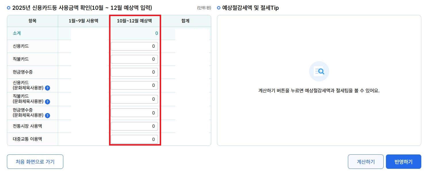 - 이후 10월 ~ 12월 사용 예정 금액을 근로자가 직접 입력하여 연말까지의 사용패턴을 반영합니다.