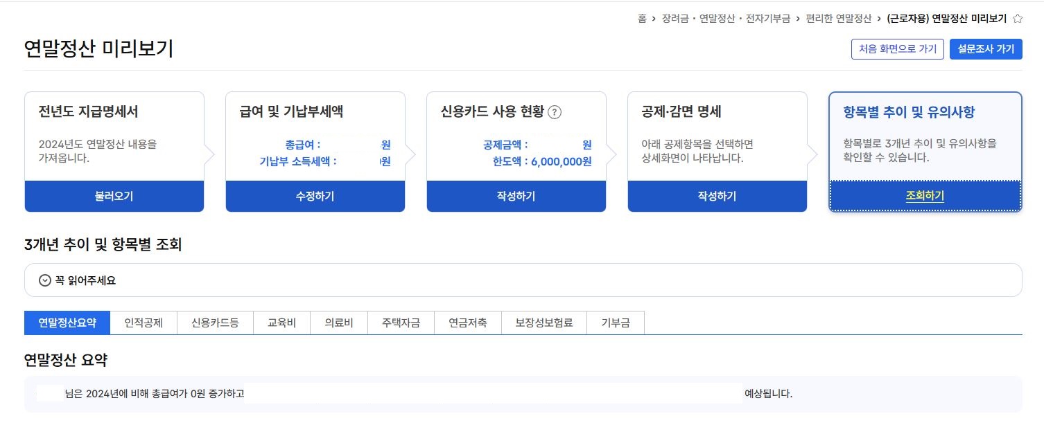- 신용카드 등 사용액 소득공제 외에도 인적공제, 주택자금, 연금저축, 기부금, 의료비 등 다양한 공제항목을 확인합니다.