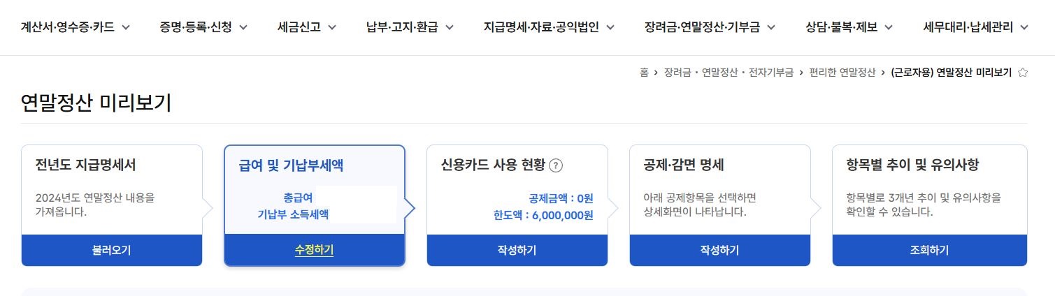 - 메뉴 경로: 장려금·연말정산·전자기부금 → 편리한 연말정산(근로자용) > 연말정산 미리보기 등을 선택합니다.